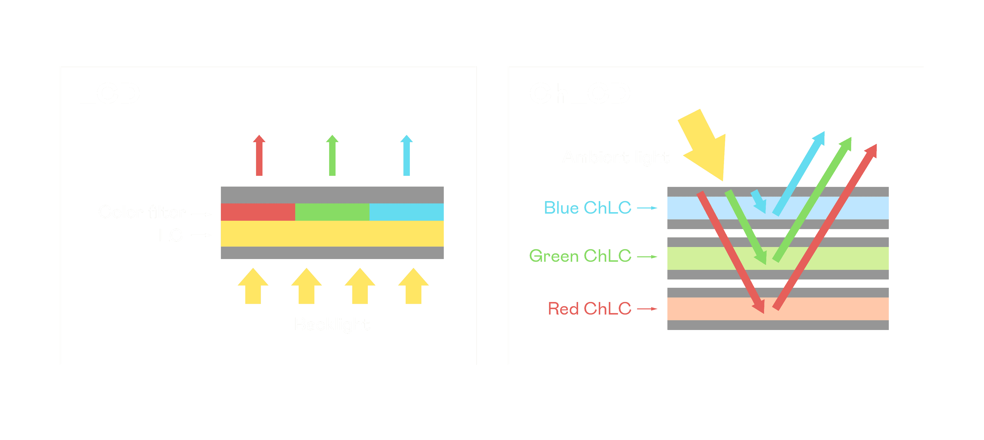 ChLCD 胆固醇液晶就如同纸张一样,,透过反射环境光来显示影像,,因此长时间观看不易造成人眼视觉疲劳,,,可达到护眼效果。。。当处于户外阳光下使用,,,LCD 影像容易失真而不易观看,,,,但胆固醇液晶仍可维持较佳的影像品质。。。。